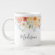 Beba seu café com estilo com nossa Caneca de Café Gigante Nome Monograma Personalizado Aquarela Floral Ensolarado. Apresentando ilustração em aquarela de arranjo de flores com cores brilhantes e texto em caligrafia elegante editável que pode ser personalizado com seu nome. Adequado como presente para amantes de flores e presente de casamento para noivas e damas de honra.