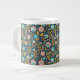 Este design de arte popular apresenta um padrão floral cor-de-rosa, laranja e verde sobre um fundo azul escuro.