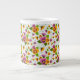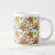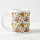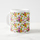 Esta linda caneca apresenta um pequeno padrão de flores cor-de-rosa e amarelas.