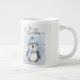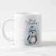 Uma ilustração encantadora de inverno de um adorável pinguim vestindo um chapéu e cachecol listrados, trazendo uma vibração acolhedora e festiva. Os flocos de neve suaves e tons azuis suaves no fundo criam uma atmosfera mágica de inverno. Perfeito para cartões de Natal, posters, adesivos e artesanatos sazonais!