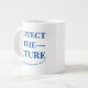 Uma caneca jumbo esportando a design que diz "Proteger o Futuro: Ficar com a Democracia" por expressar desejo por um futuro onde a liberdade esteja garantida. Você pode personalizar o conteúdo textual e a cor de seu gosto.