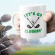 O design engraçado do taco de golfe apresenta uma legenda fofa "Vamos ao Clube" em verde, disposta com dois tacos de golfe e uma bola de golfe em preto e branco sólidos sobre um fundo branco. Envie uma mensagem abaixo desta listagem ou e-mail para beachpause@gmail.com com pedidos de cores personalizadas. Ótima ideia para o golfista ávido na sua vida!
