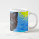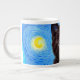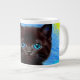 Café Mug apresentando um gato preto na pintura Starry Night de Van Gogh! Este gatinho de olhos azuis brilha adoravelmente de um fundo de espirais azuis e uma lua amarela brilhante. Um presente fantástico para amantes de gatos e colecionadores de arte holandeses!