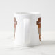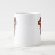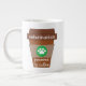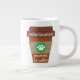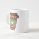 Esta caneca de café exibe uma xícara de café marrom com o texto "veterinário - movida a café". Há uma pata branca sobre um fundo verde na manga da xícara.