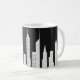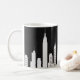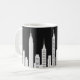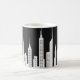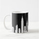 Une composition visuelle saisissante sur un mug mettant en scène des silhouettes de gratte-ciel blancs finement alignés sur un fond noir profond, un design urbain minimaliste. Cette skyline moderne contrastée évoque l’élégance architecturale des métropoles contemporaines et s’adapte parfaitement à une décoration murale monochrome chic. Ce visuel noir et blanc offre une ambiance sobre et sophistiquée, idéale pour sublimer des mugs modernes aux designs urbains épurés.