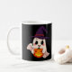 This cute yet creepy Halloween ghost mug features a smiling ghost wearing a witch hat and holding a glowing jack-o-lantern — designed to instantly grab attention and spread festive vibes.