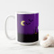 Uma caneca de café divertida e assustadora com um design de halloween fofo. Colocado em um cemitério escuro e assustador. Um cascalho diz RIP, com uma vela e alguns crânios brilhantes no chão. Uma vedação cremosa velha se inclina para o lado. Um adorável esqueleto sorridente está acenando e alguns fantasmas legal estão girando no ar. Uma coruja senta-se na árvore com olhos brilhantes e uma lua crescida está ao lado com morcegos voando nas proximidades. Definido em um plano de fundo de gradiente roxo.