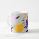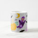 Esta caneca de café branca apresenta cores e fantasmas não tradicionais do Halloween, teias, cogumelos, morcegos e flores.