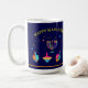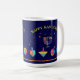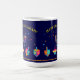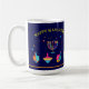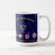Happy Hanukkah Beautiful Jewish Holiday Festival of lights Design. Jewish Holiday Hanukkah Vintage navy blue festive background with traditional Chanukah symbols - Gold Menorah, Hanukkiah Candelabrum and Candles, wooden dreidels (spinning top), donuts, star of David and glowing lights wallpaper pattern. Hanukkah Festival Decoration. Jerusalem, Israel. Home & Living > Kitchen & Dining > Drinkware > Mugs & Cups beautiful design with two sides graphic decoration. Trendy Design with custom text template. Minimalist, Modern design. Personalize them by adding or change invitation text. (Perfect for Family Event, Friends, Kids Festival, Classroom, Letter from Teacher, School Party)