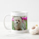 Características deste produto Hermes, um cão de filhote de cachorro maltês pequeno doce que está entre algumas tulipas bonitas do primavera.