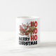Hohoho Merry Christmas. Illustratie van een vrolijke kerstman in een slee met twee rendieren.