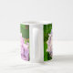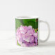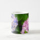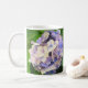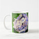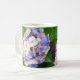 Uma fotografia de hortênsias azuis e roxas em uma caneca de café.