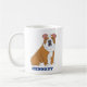 Crie um presente personalizado que seja perfeito para amantes de cães e donos de cães. Esta caneca de café apresenta um estilo realista de ilustração de um buldogue inglês em castanho claro e branco. Abaixo do gráfico está um ponto para adicionar um nome em negrito marinho em caracteres azuis. A ilustração e o texto aparecem em ambos os lados da caneca.