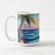 Pretty seaside coastal coffee cup with a gorgeous ai impasto oil painting style illustration of blue ocean waves crashing on a sandy beach, that is covered in sea glass and surrounded by palm trees at sunset and sunrise.
