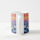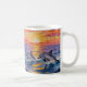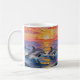 An ai impasto style dolphins swimming with a pink, orange and purple sunset over the ocean . A beautiful coastal coffee cup to add a beachy touch to your drinkware.