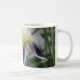 Fotografia da flor íris púrpura, branca e amarela numa caneca