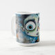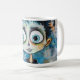 Um caráter caprichoso com olhos sobredimensionados e cabelo pontiagudo é representado por uma expressão atordoada sentada numa mesa com uma xícara de vapor e uma torradeira esquisita. Por trás do personagem, o fundo é vivo, repleto de vários esboços e rabiscos que dão uma vibração divertida e caótica à cena.