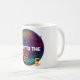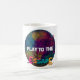 O design da xícara apresenta a frase "Tocar para Fugir" exibida com destaque em tipografia dinâmica e em negrito. As palavras são colocadas contra um fundo vibrante e abstrato que sugere aventura e entusiasmo. O design geral transmite um sentido de liberdade, diversão e o poder da brincadeira para transportá-lo para um mundo diferente.