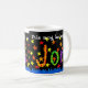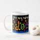 Uma grande caneca branca com as palavras "Esta caneca pertence a" em letras brancas, seguida por "Jon" em colagem de papel pintado à mão, com uma aspersão de estrelas vermelhas, laranja e amarelas, sobre fundo preto. Micro-ondas e máquina de lavar louça em segurança.