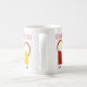 Uma caneca com dois pacotes de condimentos sorridentes. Os personagens de ketchup e mostarda estão sorrindo um para o outro na frente de um coração vermelho e amarelo. As palavras podem ser personalizadas.