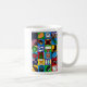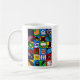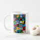 Uma caneca de café com uma grade de objetos kiwiana retratados nela em cada lado da caneca. © Radenbrea Studios na Zazzle, Uma ótima caneca para dar de presente, ou para qualquer um que ama a Nova Zelândia.