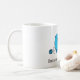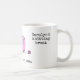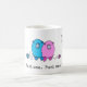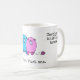 Knit um. Purl um. Esta caneca de um tricô é decorada com dois desenhos fofos, estilo cartoon, ovelhas engraçadas, um rosa, o outro azul, e as palavras "Knit one". Purl um." Ele pode ser personalizado com seu nome e/ou palavras. É perfeito para qualquer um que tricota.