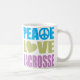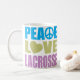 Lacrosse do amor da paz… que outros você precisam na vida? Presente perfeito para algum viciado dos lacross. Não importa se você é um jogador profissional treinado do lacrosse, você joga o lacrosse para sua equipe do segundo grau do time do colégio, você está indo à faculdade em uma bolsa de estudos do lacrosse, você ama olhar o lacrosse, você é a mamã ou o pai orgulhoso de um jogador do lacrosse da estrela, ou você apenas como a recolhe acima alguns amigos e lacrosse do jogo nos fins de semana… você é viciado aos lacross! Ideia engraçada do presente para algum jogador do lacrosse. Excelente para alguma diva do lacrosse. Características de design um coração e um sinal de paz. Veja nossa loja para mais divertimento e paz original amar… camisas e presentes.