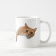 Retrato de uma taça laranja de taça doméstica de gato deitado sobre um fundo branco com pata cortada sobre uma mesa