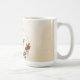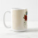 Caneca de café única com flores românticas em laranja queimada e azul naval e folhas verdes.