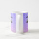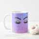 Lâmpadas de vidro feminino modernas e caneca de café salão com belos olhos de maquiagem e sobrancelhas sobre uma mauve roxa de gradiente holográfico e fundo brilhante de lavanda lilás. ++++++++++++++++ Personalize-o com o nome de salão roxo do técnico e pastel.