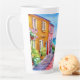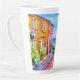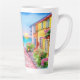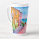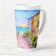 A caneca latte com vida na praia apresenta uma vila ao lado de casas coloridas de 2 andares, potes de flores e visões de veleiros no pôr do sol.