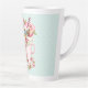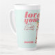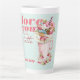 A caneca latta personalizada, escrita com "ama-te um latte". Design com um padrão de bolinhas retrô e ilustração de uma caneca latta carregada de morangos e creme, macarões, rosquinhas e doces.