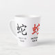Moderno Ano Novo Chinês Lunar do Nome Personalizado da COBRA Latte Mug com TEXTO PERSONALIZÁVEL, projetado em três lados com o símbolo lunar zodíaco chinês para os quadrados COBRA de quadrados das cores populares preto, vermelho e amarelo. Há três TEXTOS PERSONALIZÁVEIS, onde você pode adicionar seu nome, sua saudação (por exemplo, Parabéns) ou criar seu próprio texto. Este Ano da caneca-COBRA faria uma adição de excelente à sua coleção de caneca zodíaca chinesa, e pode ser dada para aniversários e Natal, assim como presentes de Ano Novo. Escolha entre uma ampla seleção de designs de Ano Novo Chinês Lunar para cada sinal do Zodíaco Chinês em cartas, decoração doméstica, roupas e presentes, desenhados por Designs Bereanos.