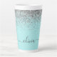 Aqua Azul - Verde Água e Faux Folheado Prateado Metalizado Brilho Monograma Nome Café Latte Xícara Caneca. Isto torna o presente perfeito para 16 anos, casamento, chá de noiva, aniversário, chá de bebê ou despedida de solteira para alguém que ama luxo e estilos chiques.