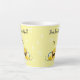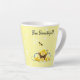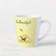Essa pequena caneca de café apresenta um design feito de uma cesta de limões com uma abelha pequena, sobre um fundo amarelo. Na frente e atrás da caneca estão as palavras "Bee BeauBonito!"