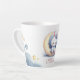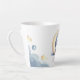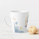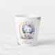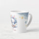 Uma caneca de leite super fofa com um belo coelhinho branco vestindo um belo arco giro sentado numa lua amarela com estrelas douradas caindo e algumas nuvens azuis empoeiradas.