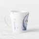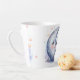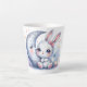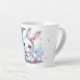 Uma caneca de leite super fofa com um belo coelhinho branco vestindo um belo arco e a lua crescente com estrelas douradas caindo e algumas nuvens azuis empoeiradas.