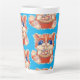 Um gato de desenho animado com olhos grandes e brilhantes está balançando uma pizza enfeitada de peixe e outros sapos. O uso lúdico de cores e recursos exagerados adiciona um toque caprichoso.