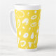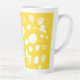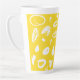 Essa caneca exibe diferentes formas manchas brancas e linhas circulares simbolizando grãos de café, sobre uma superfície laranja amarelada. A ilustração é feita à mão.