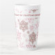 Crie a sua caneca de café única para a época de férias de inverno. O texto de exemplo diz "'Esta é a estação do natal com lattes salgados" e você pode mantê-lo ou editá-lo como desejar. Design elegante e festivo com um padrão de flocos de neve em vermelho e rosa.