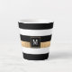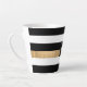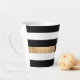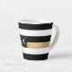 A caneca de latte de chic moderna é feita em um padrão de riscas horizontal em negrito preto, branco e dourado.  Um bloco de monograma preto e de ouro, na frente da caneca, tem um monograma branco de solteiro, pronto para personalizar.