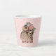 Coruja de bebê bonita com um arranjo floral na cabeça. O fundo é cor-de-rosa com pontos. Monograma opcional