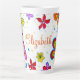Design floral retrógrado de cor clara no café alto ou na caneca latta. A caneca branca, alta, tem flores grandes em torno de um modelo de nome central em um roteiro laranja. Esta caneca vem em dois tamanhos e a design funciona bem em ambos.