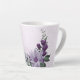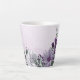 Linda caneca de latte botânico com flores roxas lavanda românticas e brancas com folhas verdes