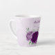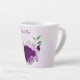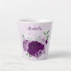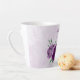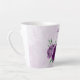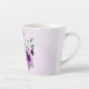 Linda caneca de latte romântica com flores roxas e algumas folhas verdes .