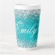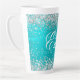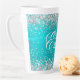 Garota cintilante prateada cintilante em uma turquesa ou gráfico de arte digital em forma de metal azul aqua. Personalize o estilo de fonte clássico de caligrafia do rico para criar sua própria caneca latta grande. Uma caligrafia branca elegante clássica com sombra aqua na trabalho de arte digital moderna que impressão como uma foto.