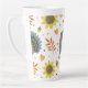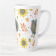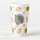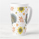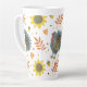 Um padrão aquoso de perus de cinza azul, girassóis e bolotas ouros, corações e folhas cor de laranja contra fundo branco