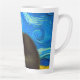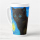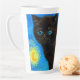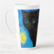 Latte Mug com um gato Van Gogh no estilo da Noite Estrelada! Um gatinho negro e fofo permeia uma mesa contra um céu azul e uma lua amarela. Um presente perfeito para amantes de gatos e colecionadores de arte holandeses!