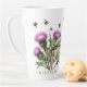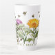 Ervas e abelhas, caneca latta. As mamangabas borrifam-se sobre a arinca florida púrpura, a fios brancos e o calendário amarelo nesta embalagem à volta do design que cobrir uma caneca branca alta. Adicione texto na parte inferior em letras maiúsculas verdes ou deixe-o vazio.