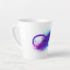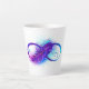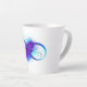 Símbolo infinito com uma bela pena pintada em cores roxas e azuis brilhantes sobre fundo branco.